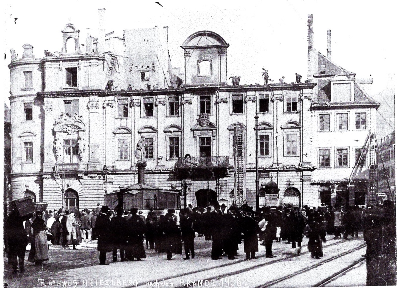 1908 Großbrand Rathaus In der Nacht vom 1. auf 2. März 1908 (Rosenmontag) schlagen hohe Flammen aus dem Dachstuhl des Rathauses, um dessen Um- bzw. Erweiterungsbau man sich im Heidelberger Bürgerausschuss schon seit über zehn Jahren heftig gestritten hatte. Ein böiger Ostwind entfacht einen heftigen Flammenregen, der sich westwärts ergießt und über der Heiliggeistkirche niederfällt. Als die Feuerwehr auf dem Marktplatz eintrifft, zünden die Funken bereits auf dem Dach des Chores und der Turmkuppel. Auch auf der Heiliggeistkirche müssen Feuerwehrmänner eingesetzt werden, um die durch Funkenflug entstandenen Brände zu löschen.