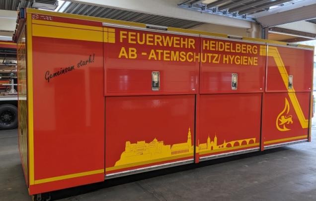 Der Abrollbehälter Atemschutz dient der Lagerung von Reserveatemschutzgeräten und Atemschutzmasken der Feuerwehr Heidelberg.