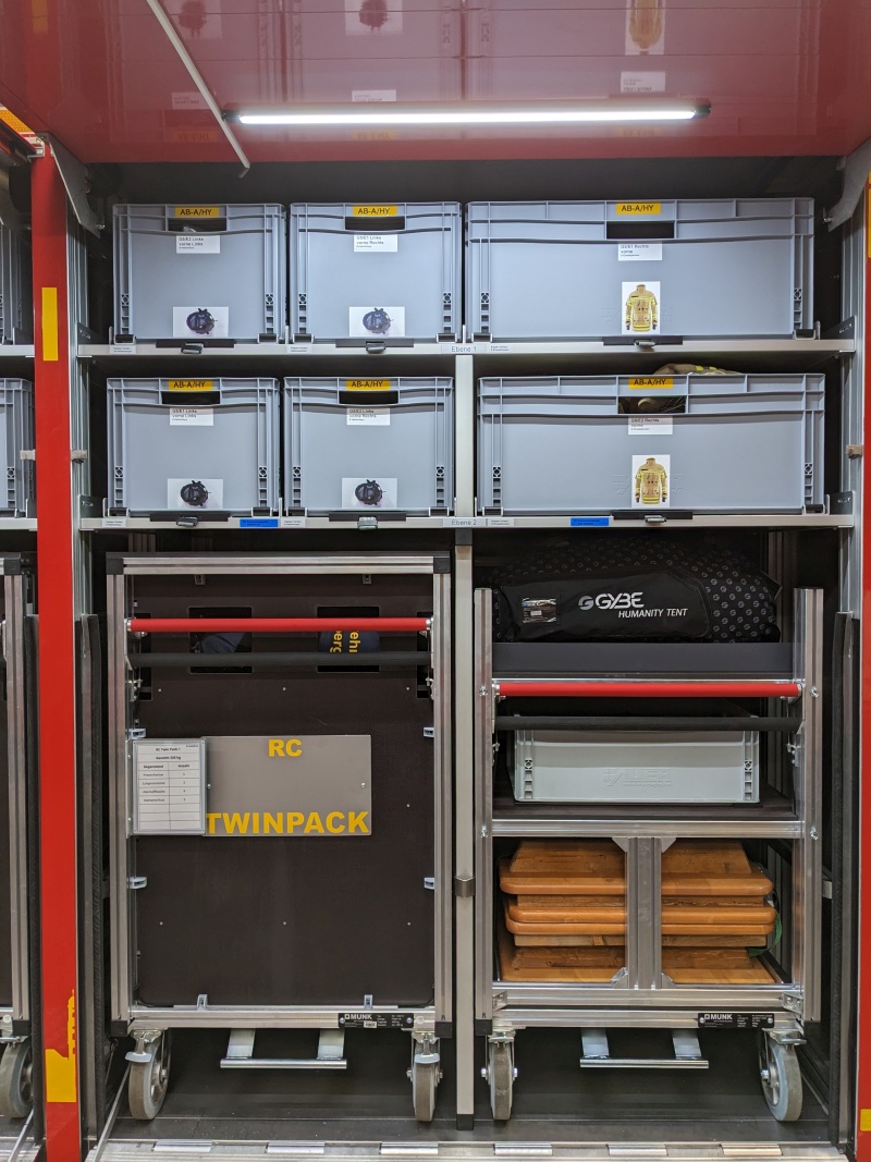 Daneben sind auf dem Abrollbehälter zusätzliche Bestandteile der Ersatzeinsatzkleidung verlastet. Hier ergänzt der Abrollbehälter Atemschutz den Gerätewagen Hygiene und bildet mit diesem eine Einheit, um Einsatzkräfte vor Ort vollständig neu einzukleiden.