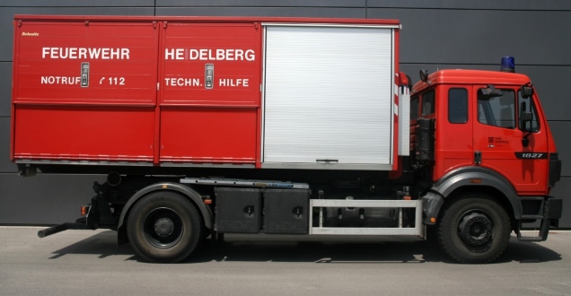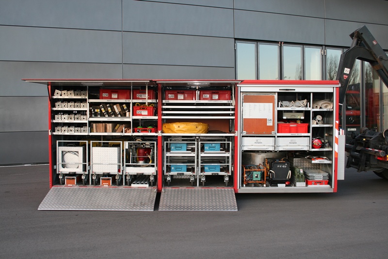 Der Abrollbehälter ist nach DIN 14505 aufgebaut. Über die Rolladenverschlüssen und die Klappenverschlüsse mit Auffahrrampen kann die auf Rollwagen verlastete Ausrüstung entommen werden.