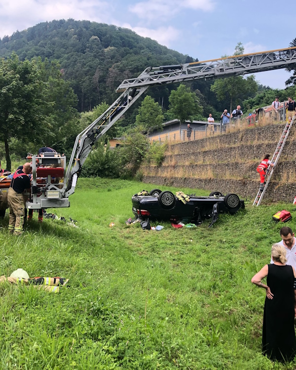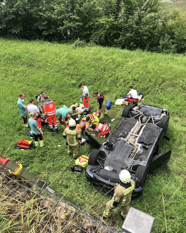 Aufgrund eines medizinischen Notfalls beschleunigte der Fahrer den PKW und durchbrach eine leichte Absperrung. Mit Hilfe der Drehleiter wurde der schwer verletzte Fahrer aus dem tiefergelegenen Bereich gerettet und an die Besatzung des Rettungswagen und den Notarzt übergeben.