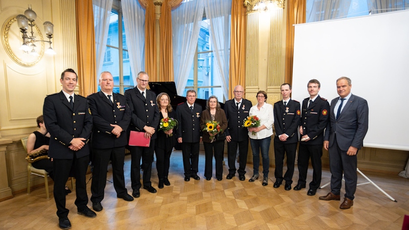 Für 25, 40 und 50-jährige Dienstzeit wurden sechs Feuerwehrangehörige ausgezeichnet. Weitere sieben Feuerwehrangehörige erhielten für ihre 50 und 60-jährige Zugehörigkeit zur Feuerwehr Heidelberg die Dankesurkunde der Stadt.