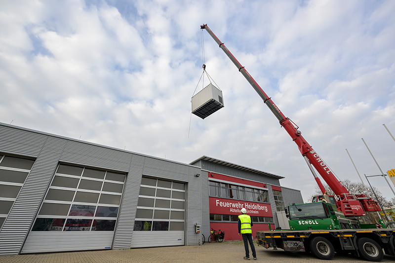 Die Stadt Heidelberg hat die ersten drei Feuerwehrhäuser im Stadtgebiet mit sogenannten Netzersatzanlagen ausgestattet: Mittels Schwerlastkran wurden am Donnerstag, 30. November 2023, die in Containern verbauten Notstromaggregate auf Abstellflächen der Feuerwehrhäuser der Freiwilligen Feuerwehr in den Stadtteilen Kirchheim, Rohrbach und Wieblingen gehoben. Dadurch kann künftig die Einsatzfähigkeit weiterer Feuerwehrhäuser in Heidelberg im Falle eines längeren Ausfalls der Stromversorgung sichergestellt werden. Die Hauptfeuerwache der Berufsfeuerwehr Heidelberg in der Bahnstadt verfügt bereits über eine eingebaute Notstromversorgung. Bei einem Pressetermin verfolgten Holger Schlechter, stellvertretender Leiter der Feuerwehr Heidelberg, Michael Fanous, Abteilungskommandant der Freiwilligen Feuerwehr Kirchheim, und Maren Fürniß vom Hochbauamt die Anlieferung am Feuerwehrhaus Kirchheim gemeinsam.