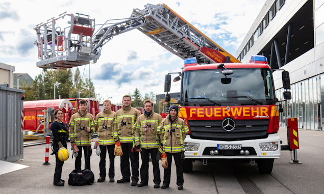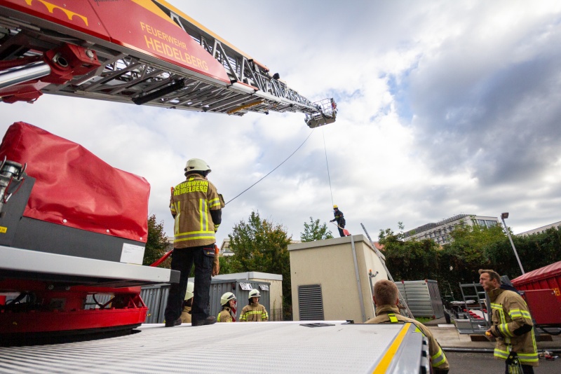 Sechs Teilnehmer aus mehreren Abteilungen der Freiwilligen Feuerwehr Heidelberg haben den Umgang mit dem Absturzsicherungsset erlernt.