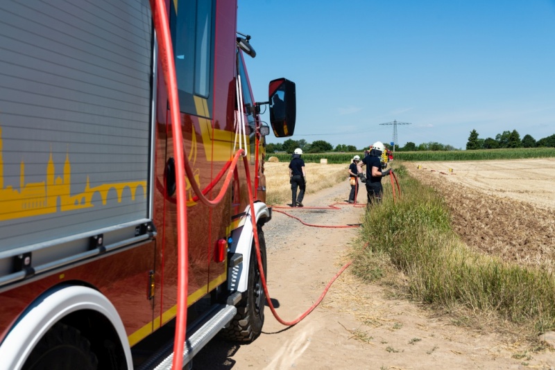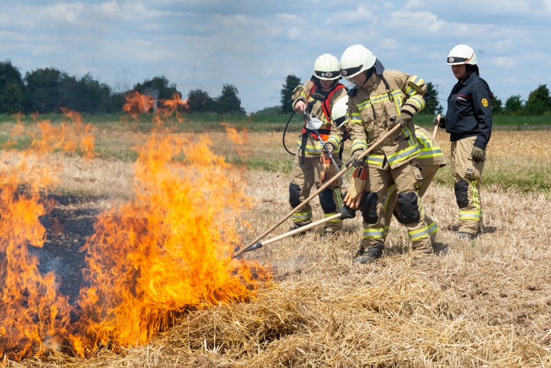 Das Stoppelfeld wurde hierzu in kleine Bereiche unterteilt und gezielt Schneisen ohne Brandgut gepflügt, so dass sich das Übungsfeuer kontrolliert und nur bedingt ausbreiten konnte.