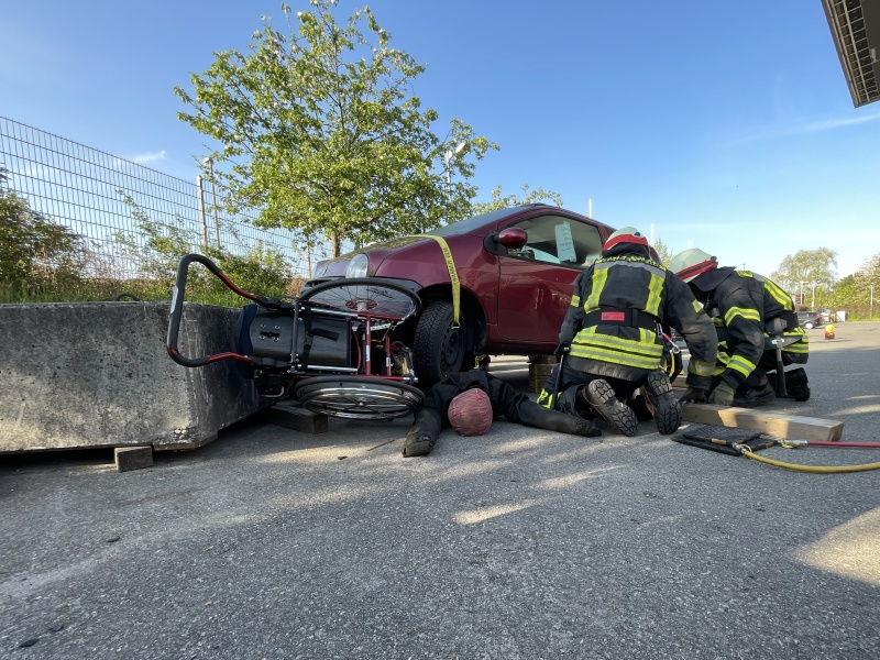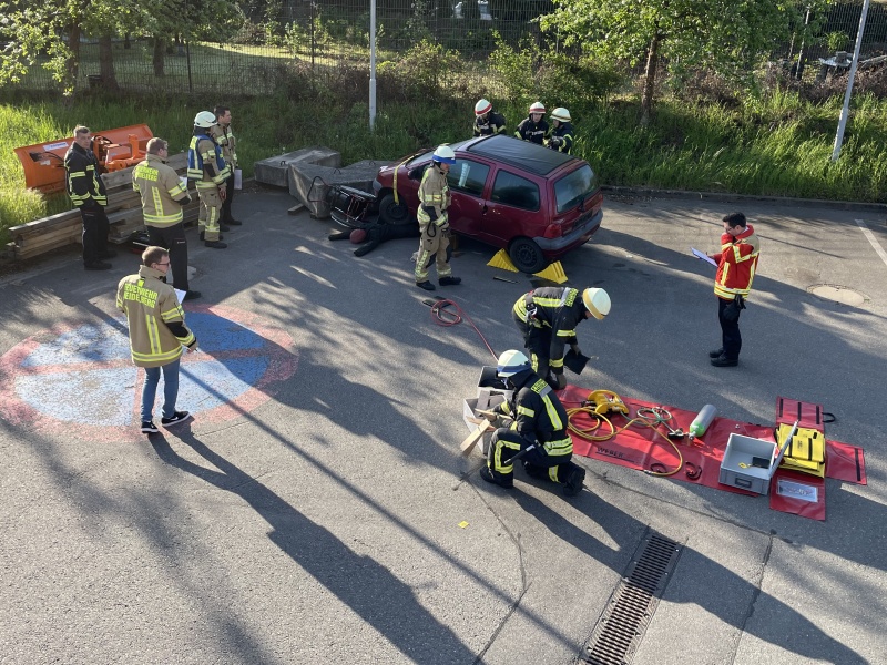 Hier galt es einen fiktiven Brand auf einem Flachdach abzulöschen und eine Person, die nach einem Unfall unter einem PKW eingeklemmt war, zu retten. Die Lehrgangsteilnehmer mussten die Einsatzlagen als Staffel abarbeiten und die Abläufe dabei Hand in Hand gehen.