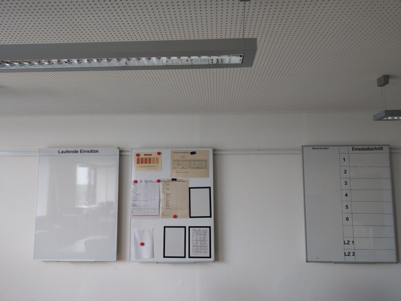 Die Lage kann auf einer Moderationswand mit Whiteboards dargestellt werden. Die Whiteboards sind abnehmbar und können zum Beispiel in den Schulungsräumen in die dortigen Wandschienen eingehängt werden. So kann das Lagebild auch dem in der Feuerwache zusammentretenden Verwaltungsstab dargestellt werden.