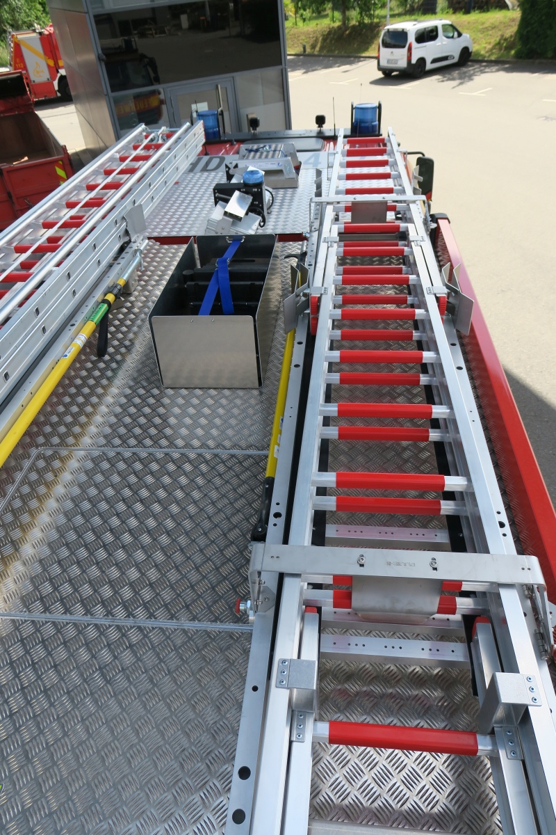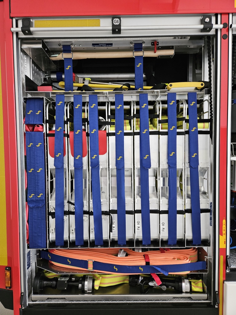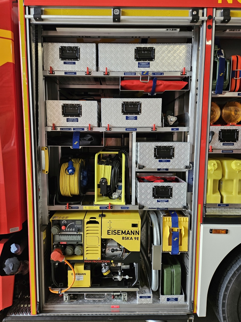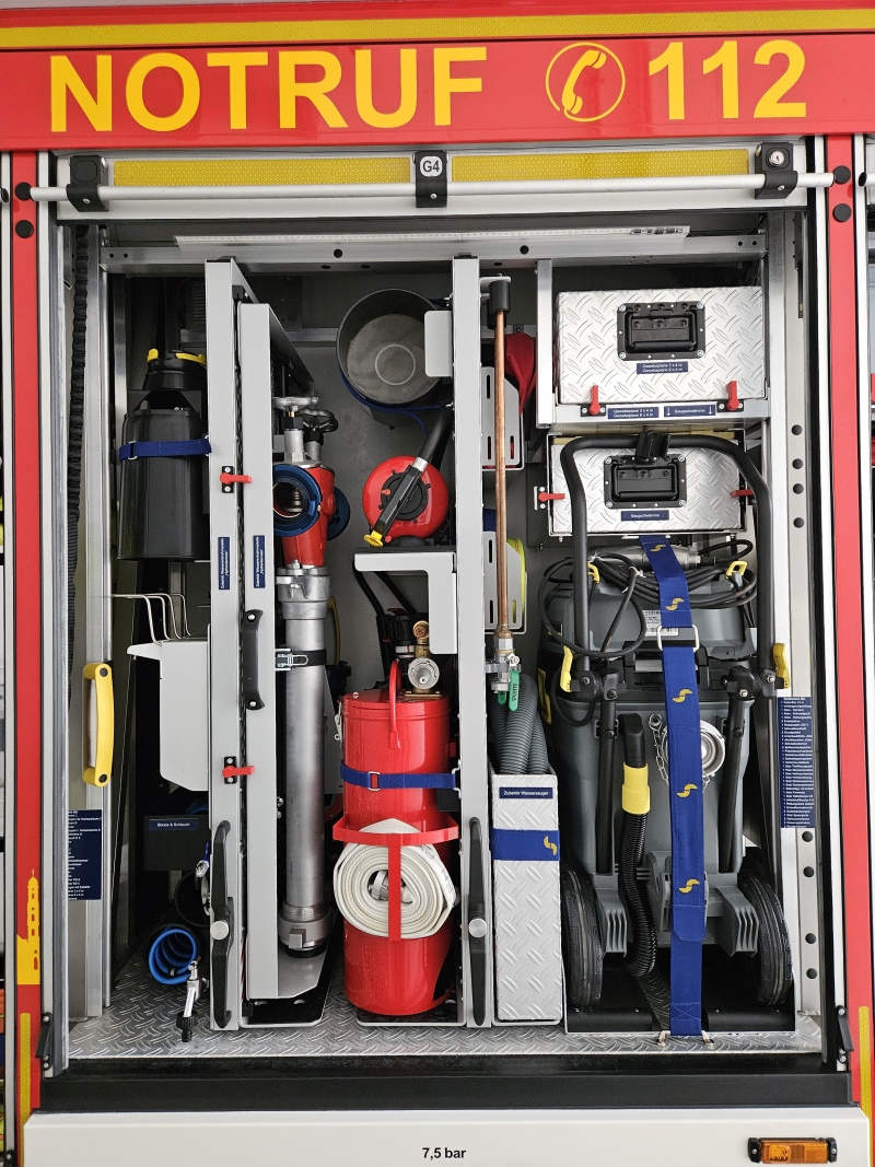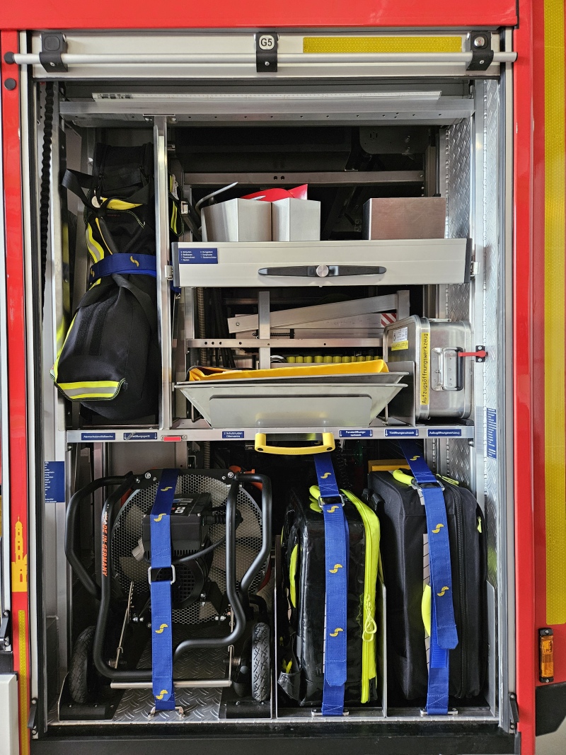 Geräteräume 1 bis 5 G1 - Stromerzeuger, diverse Schutzkleidung G3 - Einsatzstellenabsicherung, Notfallrucksack G5 - Belüftungsgerät, Schaufel, Besen, Zubehör Aufzugsbefreiung, Schuttwannen Geräteräume 2 bis 6 G6 - Brechwerkzeug, Schlauchmaterial G4 - Wasserentnahme-Kit, Wassersauger, Kleinlöschgeräte G2 - hydraulisches Rettungsgerät, Werkzeug, Stabilisierungsgerät für Unfallfahrzeuge