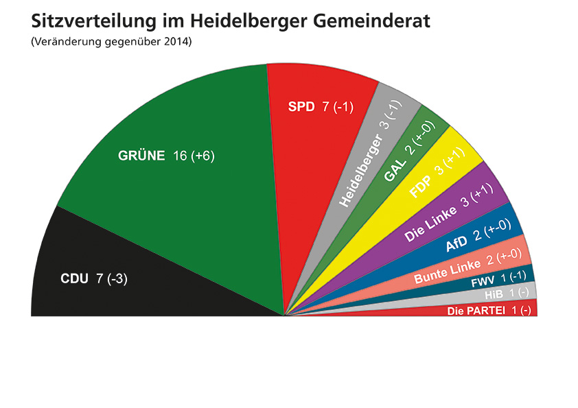 As diverse as the city itself. The following are represented in the Council: Green Party (16 seats), CDU (7 seats), SPD (7 seats), Heidelberger (3 seats), Left Wing (3 seats), FDP (3 seats), GAL (2 seats), AfD (2 seats), Colorful Left (2 seats), FWV (1 seat), "Die Partei" (1 seat), "Heidelberg in Bewegung" (1 seat). The chair of the City Council, represented with one seat, is the Mayor Prof. Dr. Eckart Würzner.