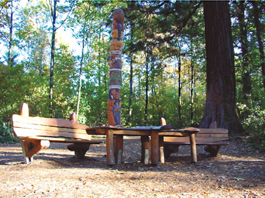 The richly detailed totem pole behind the ‘bald eagle’ table brings to mind the unbreakable bond between Man and Nature. At the same time the viewer is free to find his or her own harmony in its various contradictory images and symbols.