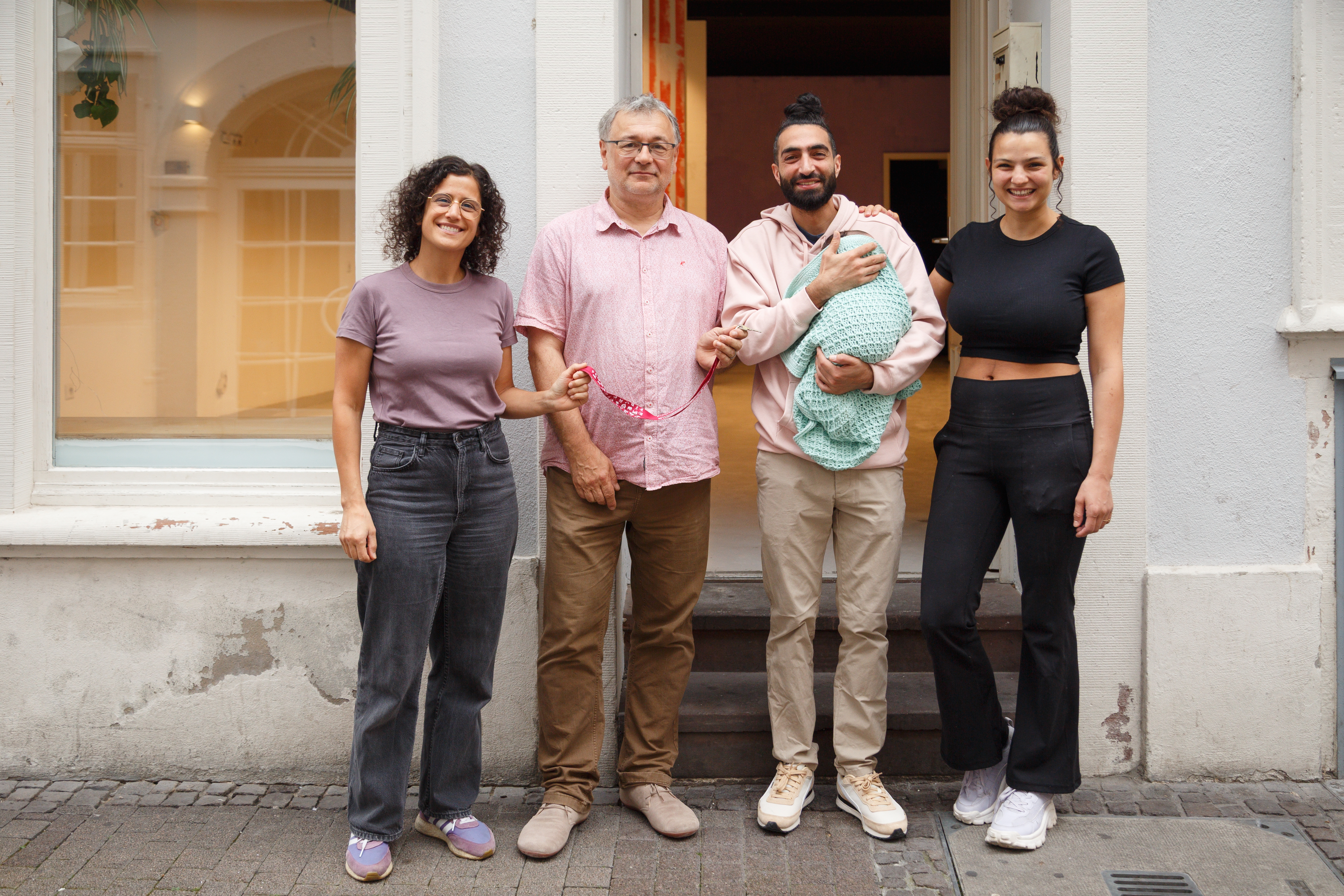 Shiva Hamid (von links) von der Stabsstelle Kultur- und Kreativwirtschaft der Stadt Heidelberg und Vermieter Mario Fadani überreichen den Schlüssel an die Nachmieter des „HeartWork“: Pajam Ghara Ghomi und Sofia Leser