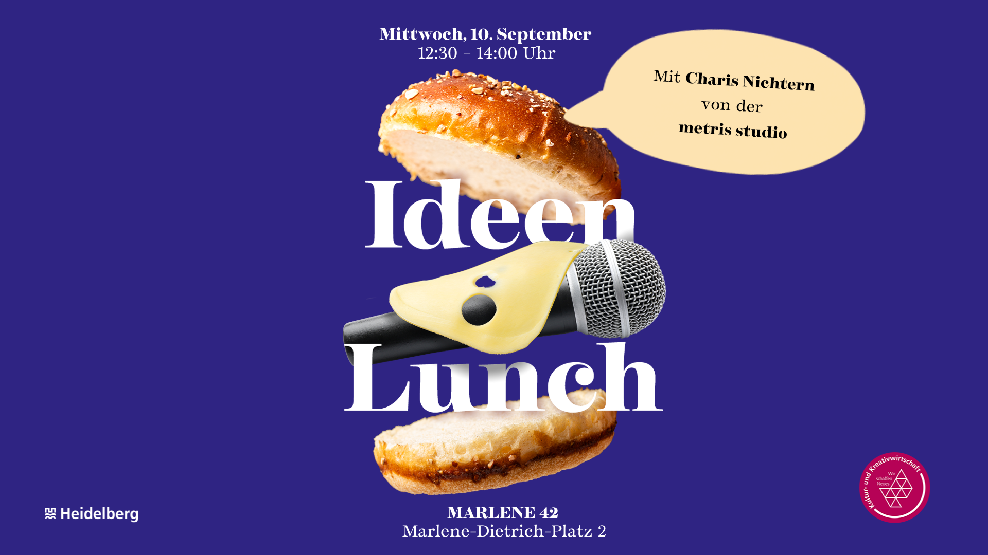 Der IdeenLunch, die Plattform für Akteurinnen und Akteure aus der Kultur- und Kreativwirtschaft, startet nach der Sommerpause mit frischem Schwung in die nächste Runde. Am Mittwoch, 10. September 2025, lädt die Stabsstelle Kultur- und Kreativwirtschaft der Stadt Heidelberg von 12.30 bis 14 Uhr ins Kreativwirtschaftszentrum MARLENE 42 (Marlene-Dietrich-Platz 2, Südstadt) ein.