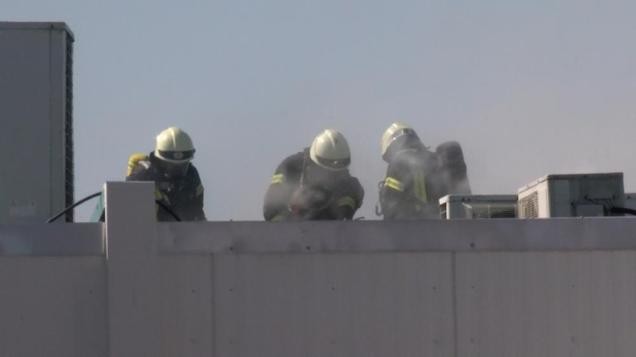 Einsätzkräfte sind auf dem Dach des Gebäudes (Foto: PR-Video) Lüftungsmaßnahmen werden eingeleitet (Foto: PR-Video) Die Drehleiter ist im Einsatz (Foto: PR-Video) Blick auf das Gebäude (Foto:PR-Video) Schwarzer Rauch steigt auf (Foto: PR-Video) Die Feuerwehr bei der Brandbekämpfung auf dem Dach des Gebäudes (PR-Video)