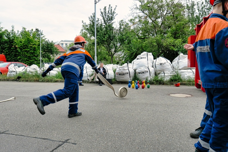 Bereits unsere Kleinsten aus den Kindergruppen zeigten eindrucksvoll ihr Können. So trugen Sie z.B. eine verletzte Person mit einem Tragetuch durch einen Parcour. Teamarbeit war gefragt, als sie zu viert stehend auf einer Cola-Kiste sich gegenseitig beim Anziehen von Uniform und Helm helfen mussten. Sichtlich viel Spaß hatten alle beim Stiefel-Weitwurf.