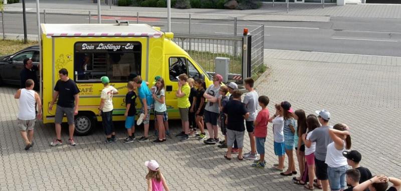 Nach dem Frühstück am Sonntag war leider schon wieder die Abreise vorzubereiten, nicht ohne jedoch einen Besuch bei der Abteilung Kirchheim zu machen. Die Kameradinnen und Kameraden hatten eine Wasserspielstraße aufgebaut, was großen Zuspruch und noch mehr Erfrischung fand. Noch größere Freude bereitete aber der zur Überraschung aller bestellte Eiswagen, der leckere Eissorten an alle Anwesenden verteilte.