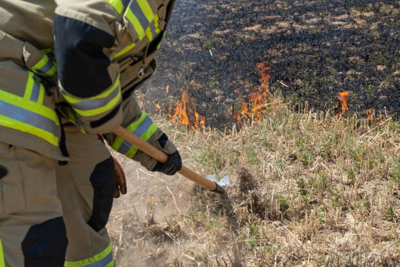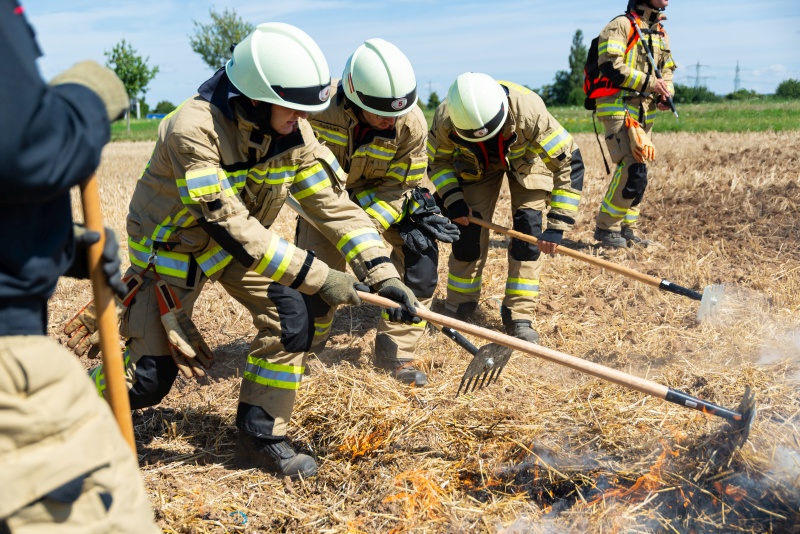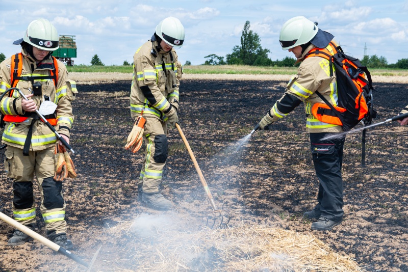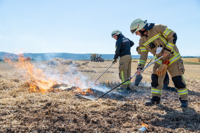 Das Stoppelfeld wurde hierzu in kleine Bereiche unterteilt und gezielt Schneisen ohne Brandgut gepflügt, so dass sich das Übungsfeuer kontrolliert und nur bedingt ausbreiten konnte.