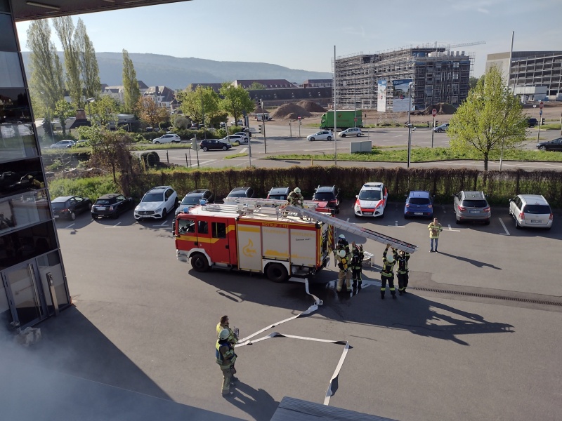 OB Würzner überraschte kurz vor einem weiteren Prüfungsblock mit einem Besuch Bei der Übung technische Hilfe war ein Verkehrsunfall das Szenario Eine Person musste unter dem PKW befreit werden Für den Löschangriff wurde ein Brand auf einem Flachdach angenommen Um das Dach erreichen zu können, musste die Schiebleiter gestellt werden Über die Leiter ging der Angriffstrupp auf das Dach ... und konnte dort den Brand ablöschen.
