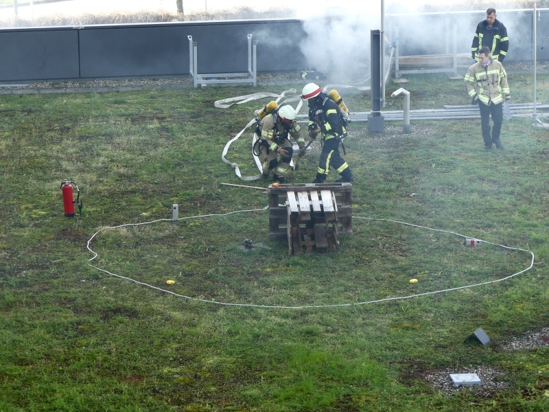 Hier galt es einen fiktiven Brand auf einem Flachdach abzulöschen und eine Person, die nach einem Unfall unter einem PKW eingeklemmt war, zu retten. Die Lehrgangsteilnehmer mussten die Einsatzlagen als Staffel abarbeiten und die Abläufe dabei Hand in Hand gehen.