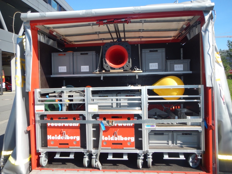 Um die Abrollcontainer den Bedürfnissen der Feuerwehr Heidelberg und auf das von hier erarbeitete Einsatzkonzept zum Aufbau einer Ölsperre individuell anzupassen, wurden die Abrollbehälter zu einem großen Teil von Personal der Berufsfeuerwehr Heidelberg selbst ausgebaut.