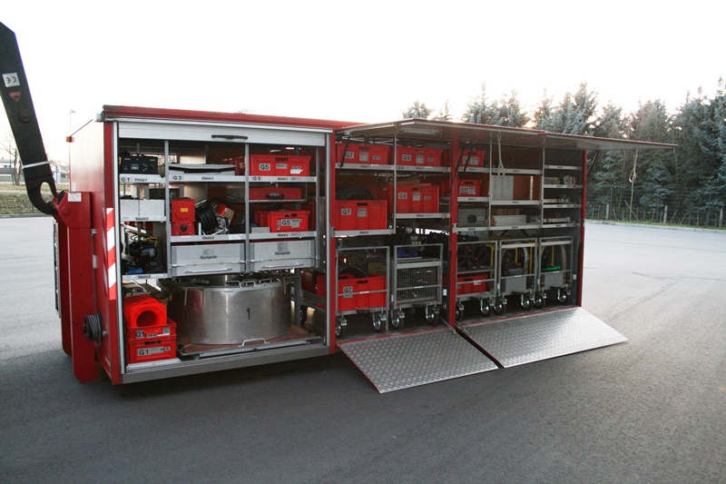 Der Abrollbehälter ist nach DIN 14505 aufgebaut. Über die Rolladenverschlüssen und die Klappenverschlüsse mit Auffahrrampen kann die auf Rollwagen verlastete Ausrüstung entommen werden.