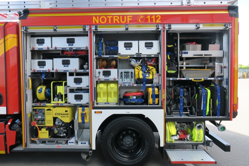 Daneben ist die nach DIN vorgegebene Ausstattung wie Werkzeugsatz, Elektrowerkzeugsatz, Verkehrsunfallsatz, Schornsteinfegerwerkzeug, Notfallrucksack, Motorkettensäge, Trennschleifer, Beleuchtungsgerät und vieles mehr auf dem Fahrzeug leicht zugänglich verlastet.