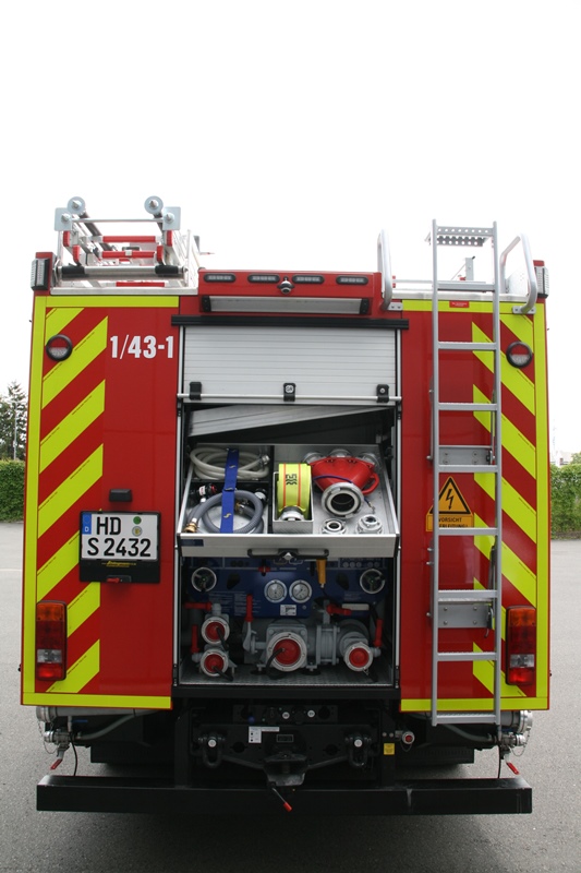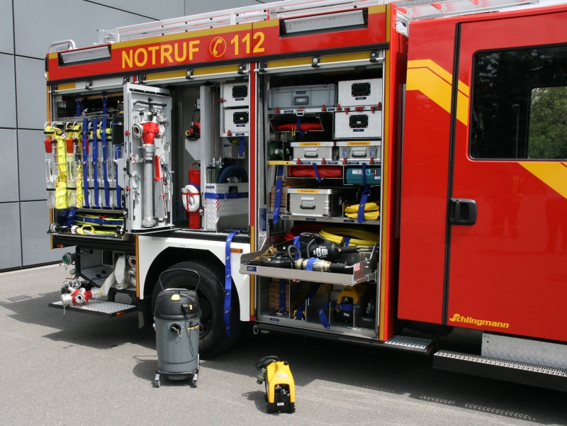 Daneben ist die nach DIN vorgegebene Ausstattung wie Werkzeugsatz, Elektrowerkzeugsatz, Verkehrsunfallsatz, Schornsteinfegerwerkzeug, Notfallrucksack, Motorkettensäge, Trennschleifer, Beleuchtungsgerät und vieles mehr auf dem Fahrzeug leicht zugänglich verlastet.