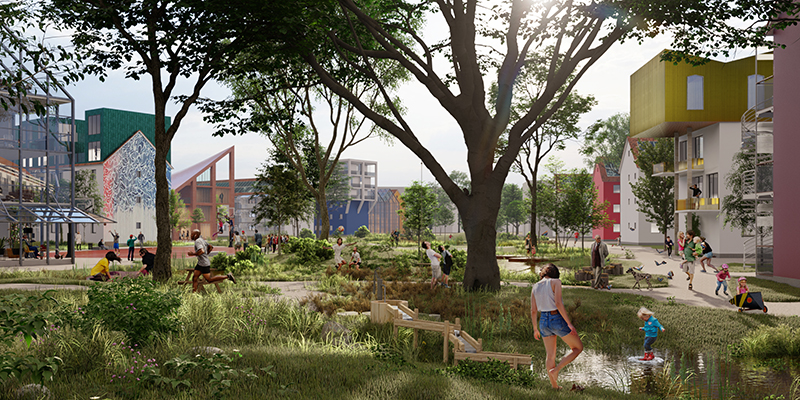 Entscheidend für das Ökosystem im PHV ist auch, dass die Wasserkreisläufe konsequent nachhaltig sind. Das Prinzip der Schwammstadt, das Regenwasser vor Ort versickern lässt – also lokal aufnimmt und speichert – und die Wiederverwendung von leicht verschmutzten Abwasser aus privaten Haushalten werden dabei umgesetzt.