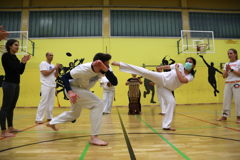 Zwei Personen bei einem Capoeira-Kampf. Im Hintergrund wird eine Trommel gespielt. Mehrere Personen stehen um den Kampf und klatschen.