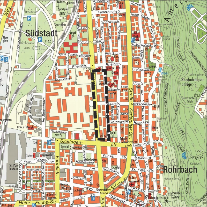 Der erste Bebauungsplan für eine der ehemaligen US-Army-Flächen steht am 18. Dezember auf der Tagesordnung des Gemeinderats. Zuvor beraten darüber am 26. November die Mitglieder des Konversionsausschusses. Der Plan befasst sich mit der Fläche „Mark Twain Village – östlich der Römerstraße, 1. Teil“ in der Südstadt. Der Geltungsbereich liegt in Nord-Süd-Richtung zwischen Rheinstraße und Sickingenstraße (ausgenommen die ehemalige Chapel und Privathäuser an der Sickingenstraße) und in Ost-West-Richtung von der Römerstraße bis zur Kirschgartenstraße (siehe Grafik). „Mit der Vorlage des Bebauungsplans liegen wir voll im Zeitplan, so dass bei einer endgültigen Billigung im Frühjahr 2015 die Sanierungsarbeiten starten und zum Jahresende wohl schon die ersten Mieter einziehen können“, sagt Oberbürgermeister Dr. Eckart Würzner.
